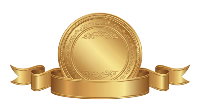 Luxurious shiny gold award medal design featuring ornate engraved details and flowing ribbon on transparent background