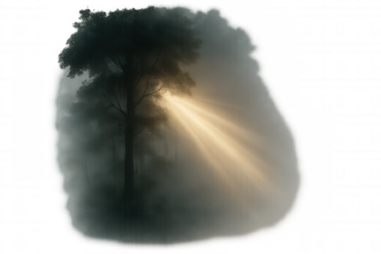 Forest fog with sun rays piercing through tree branches, creating a serene and ethereal nature scene on transparent background