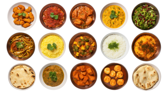Indian traditional food set, top view. pizza, hummus, biryani, chicken curry, momos, isolated on transparent and white background.PNG image