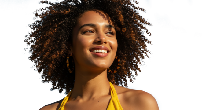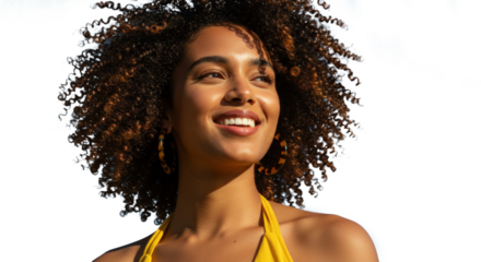 Smiling young woman with voluminous curly hair wearing a white shirt portrait transparent background