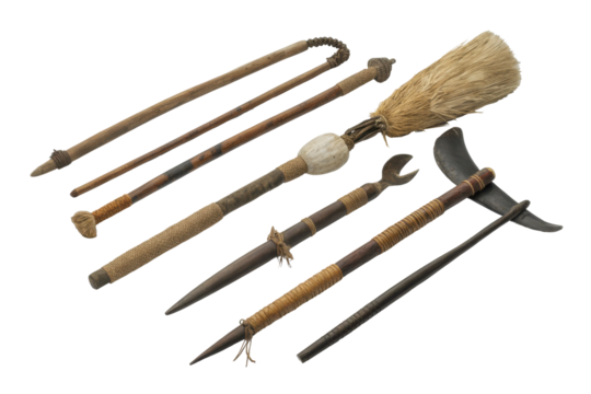 Indigenous wooden tools and artifacts isolated on transparent background