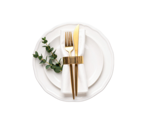 Beautifully arranged dining setup featuring a plate, utensils, and a decorated napkin with leaves, all on isolated transparent background. formal dining etiquette.