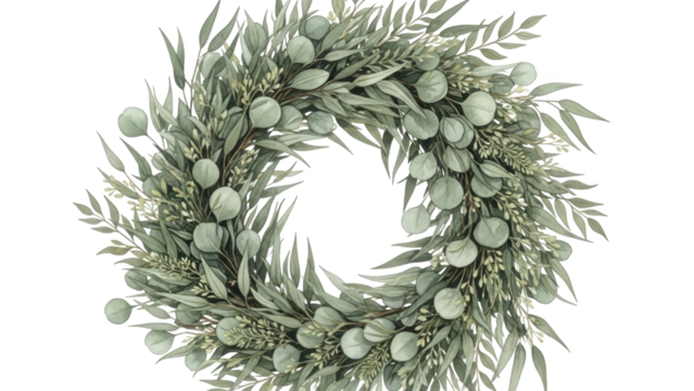 Flowing natural garlands composed of glossy ivy leaves and soft eucalyptus sprigs offer versatile plant ornamentation for digital and print media projects