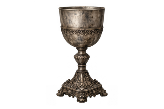 Ornate antique silver goblet cup on transparent background, symbolizing ritual, luxury, and ancient traditions