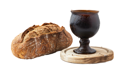 Communion elements of bread and wine in a goblet on a cloth isolated on transparent background