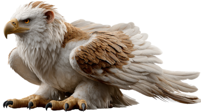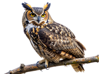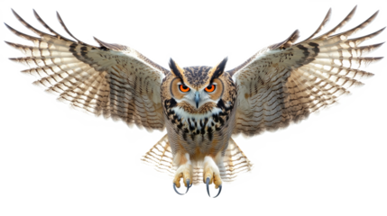 Majestic eurasian eagle owl with spread wings isolated transparent background