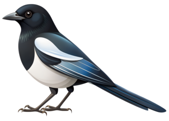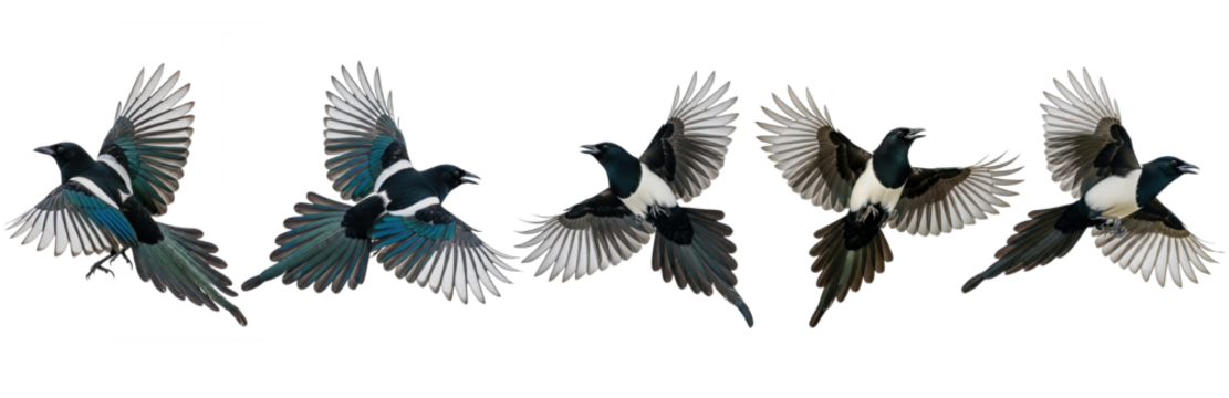 Set Of Magpie Bird Flying In Different Poses isolated on transparent background, PNG ,Eurasian Magpie, Pica pica
