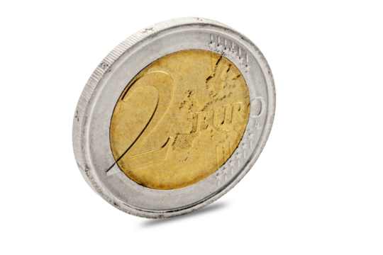 Closeup of a stack of gold chocolate coins wrapped in foil, with one euro coin prominently displayed, isolated on transparent background