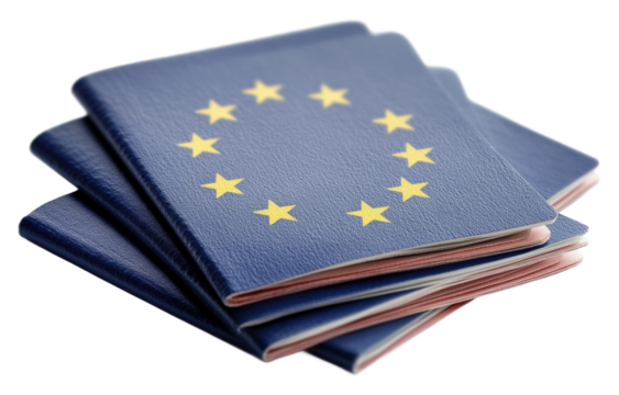 French and European passports alongside a boarding pass, set against a clean white background. Generous space for text and titles, with the added flexibility of transparency