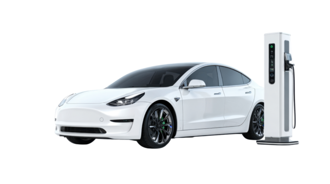 White Electric Car Charging at EV Station on white Background – Modern Eco-Friendly Vehicle Concept