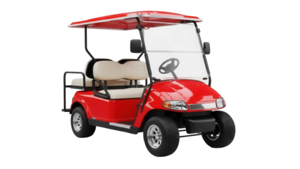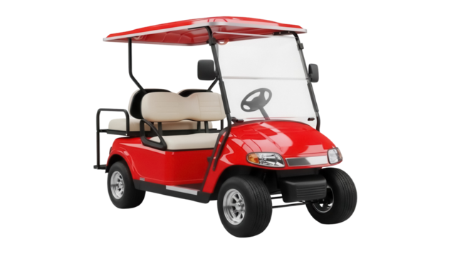 Red golf cart PNG isolated on transparent background, electric vehicle for recreation and transportation, modern buggy with roof