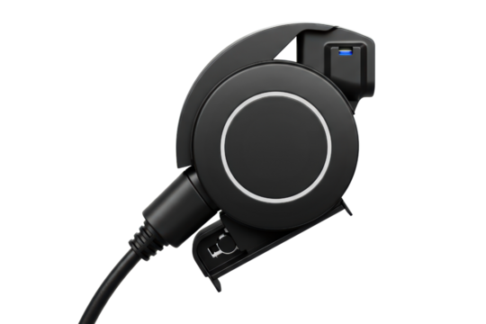 Retractable electric vehicle charging station cable and connector on a transparent background