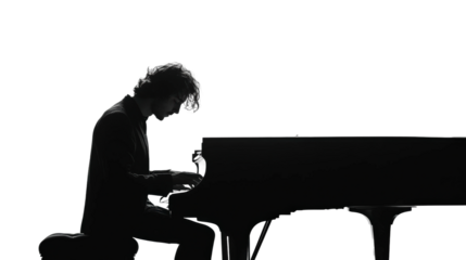 Musician plays piano in silhouette against a bright backdrop during a quiet evening performance isolated on transparent background