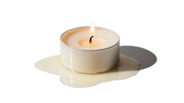 Candle burns on a surface leaving a pool of wax isolated on transparent background