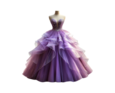 Beautiful female dancer in a glamorous gown executing a graceful move, isolated on white background