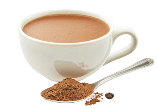 A cup of hot chocolate isolated on transparent background, accompanied by a spoonful of cocoa powder and a coffee bean, creating a cozy and inviting scene