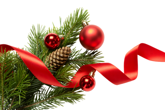 Festive Christmas decor with red ornaments, pine needles, ribbon, and pinecone creating a joyful holiday atmosphere for seasonal celebrations