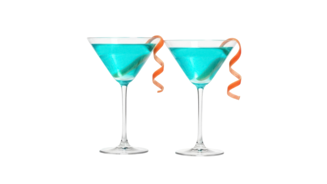 Isolated blue cocktail with ice, a slice of pineapple, and a round orange garnish atop the glass