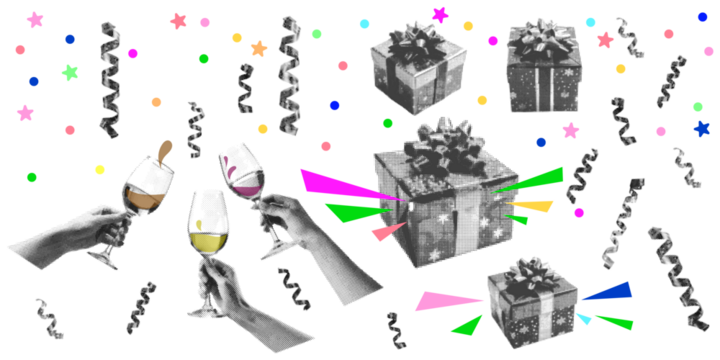 a dynamic arrangement of black squares scattered across a white background creating a visually striking contrast that suggests movement or celebration