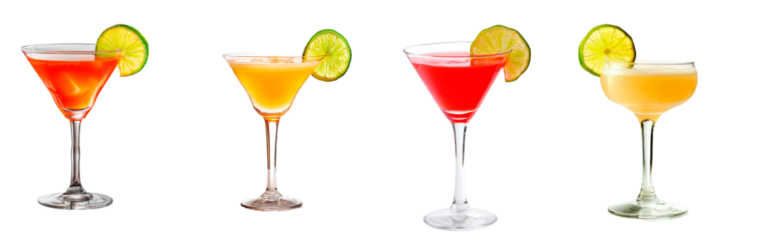 Three colorful cocktails isolated on transparent background, refreshing drinks