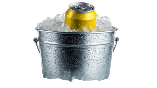 Cold yellow drink can in a bucket of ice, perfect for parties and summer vibes.