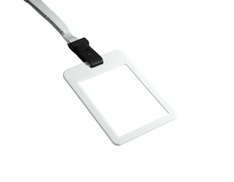 Close-up of a person in a light blue shirt wearing a red lanyard and blank white ID badge holder ID card isolated on a transparent background