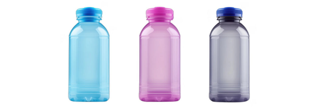Colorful plastic water bottles in blue, pink, and gray with caps, isolated on transparent background