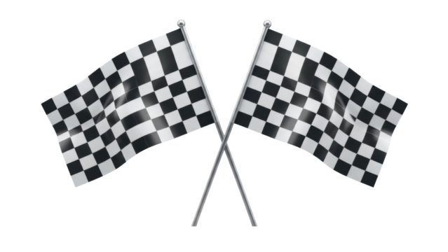 Isolated Pair of crossed black and white checkered flags waving in the wind, motorsports