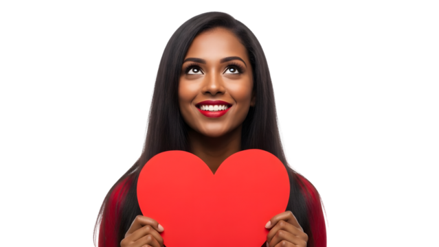 Smiling african american woman holding a red heart shaped sign isolated on transparent background with a lovely expression