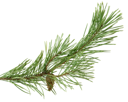 Fresh evergreen branch with vibrant needle foliage isolated on transparent background.