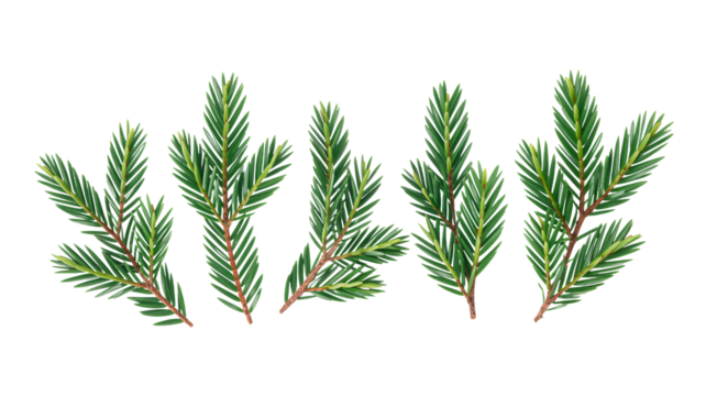 Collection of varied evergreen tree branches and conifer sprigs isolated on transparent background