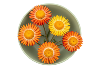 Five colorful everlasting daisy flowers in a bowl isolated, vibrant xeranthemum annuum arrangement in a container for floral design