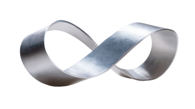 Silver brushed möbius strip shape forming an infinity symbol representing endless possibility and perpetual motion