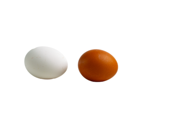 Two eggs, one white and one brown, isolated against a white background, symbolizing diversity and choice in simple, everyday items.