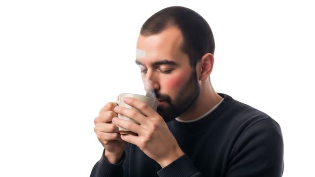 A man taking a moment to enjoy a warm beverage. The image captures the man's expression of contentment as he holds a mug.