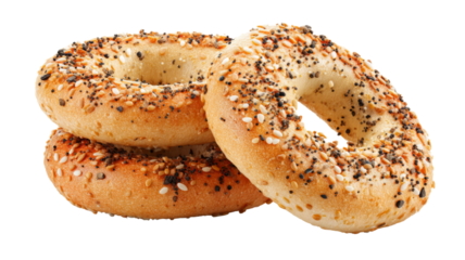 Three everything bagels with sesame seeds, poppy seeds, and onion flakes on transparent background