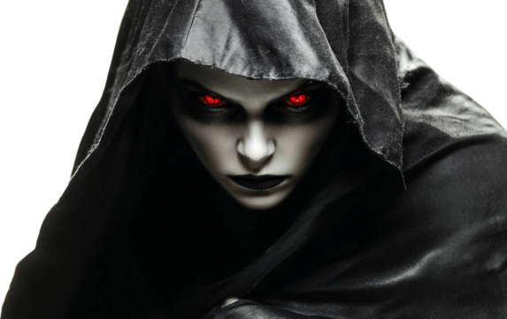 Menacing vampire character draped in a black cloak featuring glowing eyes and gothic atmosphere isolated on transparent background PNG
