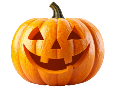 Cute Cartoon Jack-o’-Lantern with Friendly Expression, 3/4 Angled View, isolated on transparent background