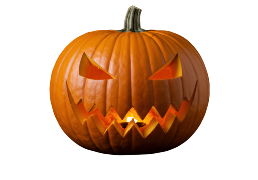 Jack-o'-lantern with menacing glowing face carving for halloween decorating on a transparent background