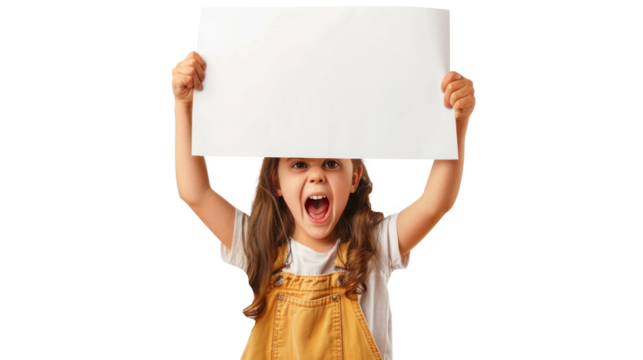 Energetic 7 year old, screaming, with a blank sheet of paper in her hands, making a revolution in the square on transparent background