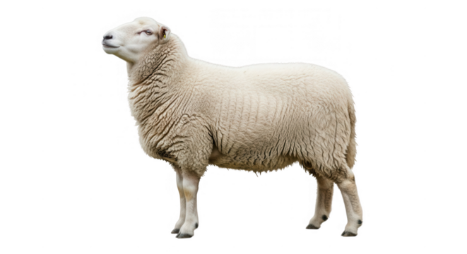 A fluffy. well-groomed sheep stands gracefully on a white background. its woolly coat. ideal for agricultural themes. animal husbandry. or livestock education