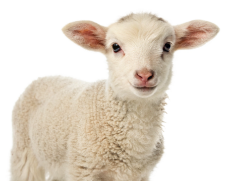 Isolated lamb portrait in standing pose looking right, domestic animal, young mammal, farm livestock