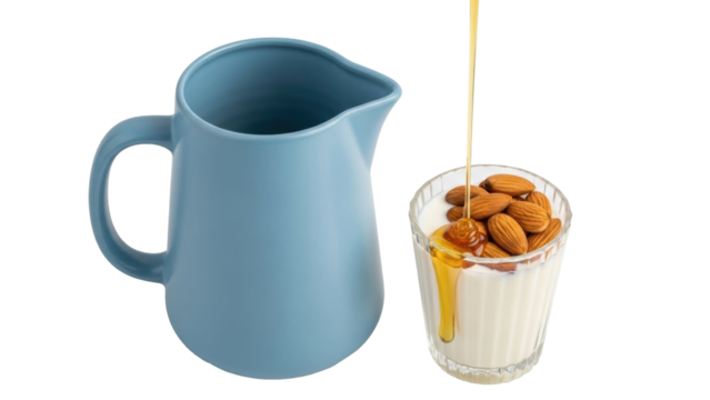 Isolated Almond milk in glass with honey being poured over almonds, light blue pitcher nearby