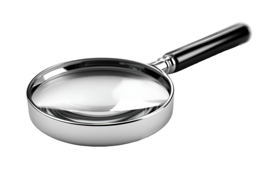 A stylized magnifying glass with a thick matte black handle on a white background for graphic design use