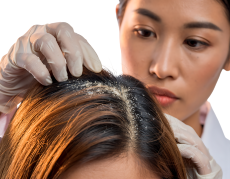 Professional dermatologist wearing white gloves meticulously examining a patient's scalp, revealing abundant, isolated on transparent background