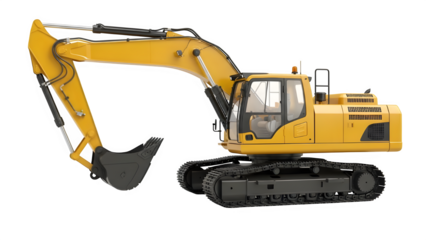 Yellow hydraulic excavator with tracks on transparent background