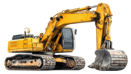 Yellow excavator on Transparent background. Working construction equipment on clear background. Bulldozer working in an open pit. tractor clean background