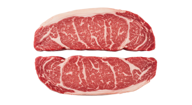 Two premium beef steaks, rich white marbling, crimson, glistening, pristine, on a transparent isolated studio background, top-down, soft high-key light. Concept of culinary excellence