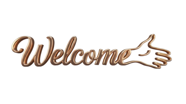 3D render of 'Welcome' text and thumbs up gesture in golden metallic style, isolated PNG with Transparent Background