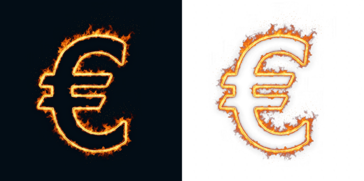 Euro currency sign on fire with sparks for Eurozone inflation stories, foreign exchange rate volatility and European Central Bank (ECB) interest decisions in business news and reporting graphics
